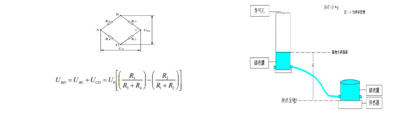 壓阻傳感器采用電阻全橋結(jié)構(gòu),如圖所示:A、C端接直流電源,B、D端為壓阻傳感器輸出的電壓。再通過(guò)A/D芯片將輸出的模擬電壓經(jīng)過(guò)處理放大轉(zhuǎn)換成數(shù)字信號(hào)。MCU采集到相應(yīng)的參數(shù)之后,通過(guò)存儲(chǔ)芯片上標(biāo)定系數(shù)擬化出所受壓力值。為保證測(cè)量的準(zhǔn)確性,在每次測(cè)量前調(diào)零使電橋平衡,即使UBD=0。