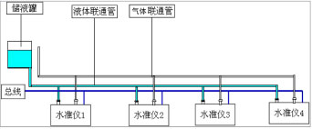 工作原理:各沉降監(jiān)測(cè)點(diǎn)安裝壓阻式靜力水準(zhǔn)儀,并需要在一相對(duì)不動(dòng)點(diǎn)安裝基準(zhǔn)罐。傳感器之間通過(guò)高強(qiáng)度的氣壓管聯(lián)接一起匯入到基準(zhǔn)罐,每個(gè)水準(zhǔn)儀內(nèi)部都安裝有高精硅壓傳感器,在基準(zhǔn)罐與傳感器之間充滿液體介質(zhì),水準(zhǔn)儀內(nèi)的壓力傳感器感測(cè)到的是該點(diǎn)到基準(zhǔn)罐液體表面的壓力,該壓力與液面高度有一定線性關(guān)系。如果壓力傳感器感測(cè)到壓力發(fā)生變化即說(shuō)明該點(diǎn)與基準(zhǔn)液面之間的高差發(fā)生變化,根據(jù)出廠前的壓力變化量與液面高差的標(biāo)定線性表,靜力水準(zhǔn)儀內(nèi)部的單片機(jī)可以計(jì)算出高差變化值。根H=P/ρ*g計(jì)算出從測(cè)點(diǎn)到基準(zhǔn)點(diǎn)液面到傳感器高度。原理示意圖如下: